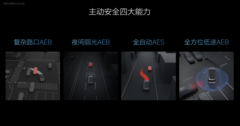 理想的主动安全包含了四大能力,分别是复杂路口的AEB、夜间弱光AEB、全自动AES和全方位低速AEB。