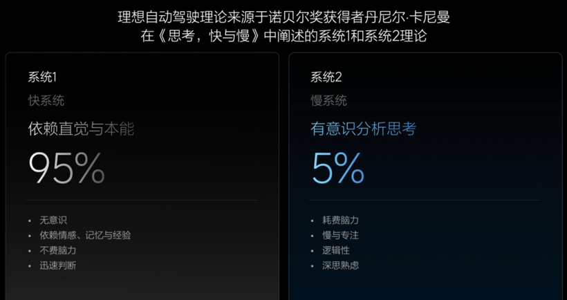 理想汽车认为,现在行业在研究的端到端技术正是自动驾驶需要的系统一,它的效率很高,善于处理简单任务,是人类基于经验和习惯形成的直觉,足以应对驾驶车辆时95%的常规场景。