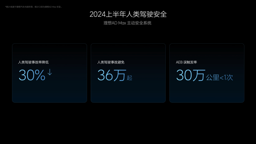 在这里理想汽车也分享了一组数据,在202年上半年,理想汽车AD Max主动安全系统已经显著降低了人类驾驶事故率:人类驾驶事故率降低30%、人类驾驶事故避免36万起、AEB误触发率每30万公里小于1次。