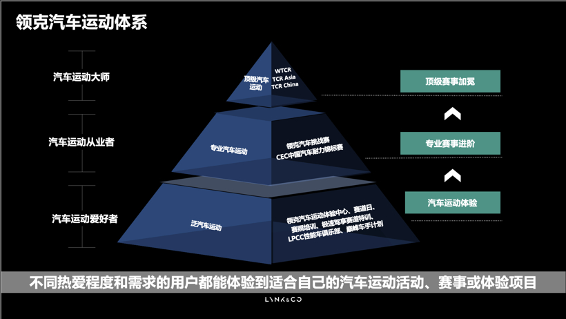 领克不仅持续打造性能优异的产品,同时也致力于中国汽车运动文化生态的构筑,针对不同热爱程度和实力的用户,提供多样化的汽车运动文化体验,以小众热爱带动大众参与,为中国汽车运动文化的发展贡献力量。面对汽车运动爱好者,领克的泛汽车运动,如“极速驾享赛道特训”、“巅峰车手计划”、“赛照培训”等,为中国赛车运动发掘新秀潜力;面对汽车运动专业用户,领克推出的“领克汽车挑战赛”品牌赛事,为他们提供了不断挑战的竞技舞台;针对专业大师和头号玩家,领克拥有TCR职业赛车完整的培训与参赛模式,让职业车手可以逐梦TCR China、TCR Asia等高端赛事。