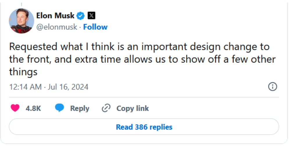 7月16日,马斯克证实已经推迟了无人驾驶出租车的发布时间,但没有确认新的发布时间。马斯克还补充说,“我要求对车辆前部的设计进行重要的修改,因推迟发布而获得的额外时间可以让我们有机会展示一些其他的东西。”