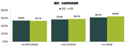 从分品牌类型指数看:4月进口&豪华品牌指数环比微降,自主品牌指数、主流合资品牌环比上升。其中自主品牌上升幅度为2.8%,流通协会分析,4月正处农忙时节,对农村消费者购车影响较大,故自主品牌销量降低、库存加大。