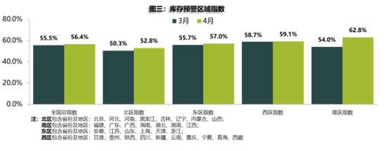 从区域指数情况看:4月全国总指数为56.4%,北区指数为52.8%,东区指数为57.0%,西区指数为59.1%,南区指数最高,为62.8%,环比上月大幅增加8.8%,主要因为南方地区销量受清明节影响较大。