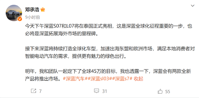 图片来源:深蓝汽车CEO邓承浩微博截图