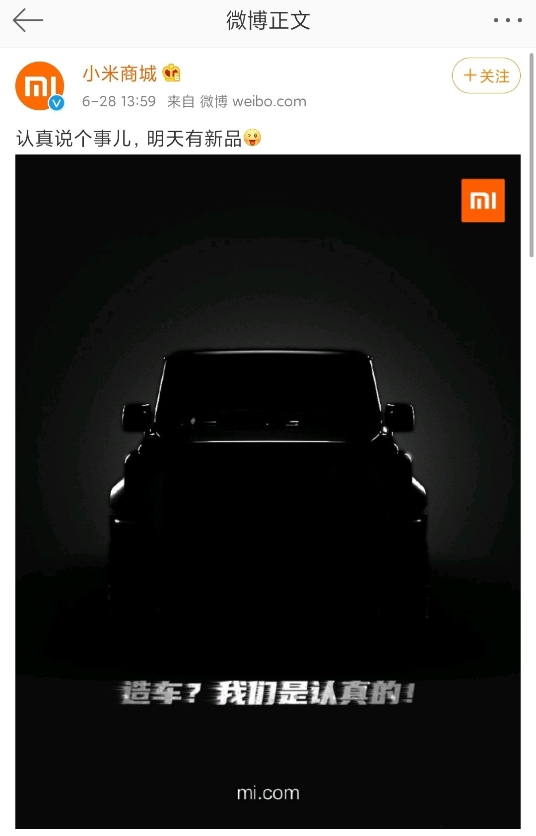 6月28日,小米商城官方微博发布了一张海报,海报中间有一个明显的汽车轮廓,并配文 “造车?我们是认真的!”,同时微博正文写道“认真说个事儿,明天有新品。” 信息发出后,关于 “小米造车”一事再度引发行业热议。不过很快这条微博就被删除,随后小米集团公关部总经理就 “造车”话题回应称,“没有的事,是小米商城新媒体同学抖错机灵了。”