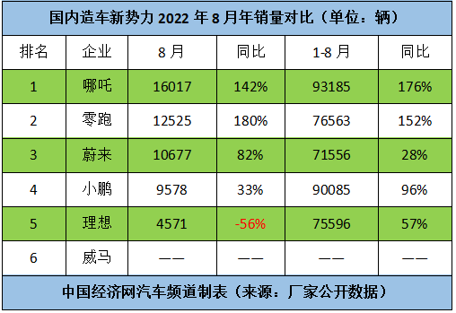 数据显示,8月,哪吒、零跑、蔚来、小鹏和理想的销量分别为16017辆、12525辆、10677辆、9578辆、4571辆,同比分别增长142%、180%、82%、33%、-56%;1-8月的累计销量分别为93185辆、76563辆、71556辆、90085辆、75596辆,同比分别增长176%、152%、28%、96%、57%。