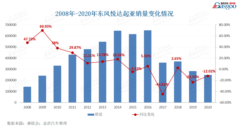 2014年之前是东风悦达起亚在国内市场上高速发展的阶段,2014年东风悦达起亚曾凭借超过60万辆的销量成绩跻身国内车企年度销量前八强。随后两年,东风悦达起亚的市场表现虽然有所波动,但整体还是维持在年销60万辆以上的高位。但进入2017年之后,东风悦达起亚的市场表现就出现了断崖式下滑,至2020年全年销量已经不足25万辆。