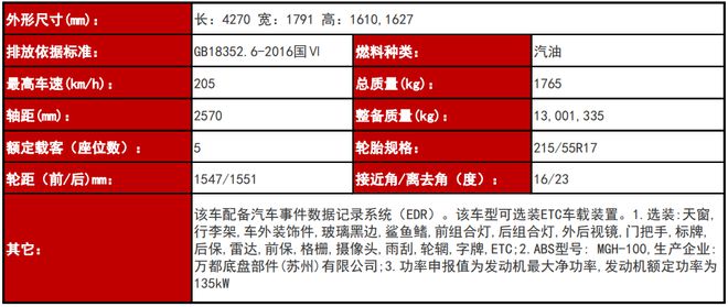 车身尺寸方面,新车长宽高分别为4270/1791/1610(1627)mm,轴距为2570mm,数据与现款车型基本保持一致。值得注意的是,新车配备汽车事件数据记录系统(EDR),还可选装ETC车载装置、天窗、行李架、车外装饰件、玻璃黑边、鲨鱼鳍,前组合灯、后组合灯、外后视镜等。