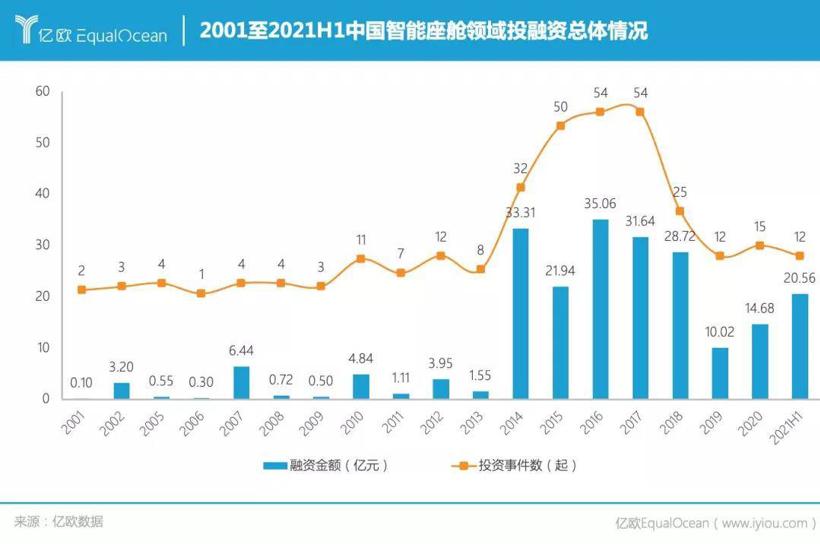 仅2021年上半年,中国智能座舱领域共发生12起投融资事件,已披露融资金额便高达10.8亿人民币。根据亿欧数据显示,2021年中国智能座舱领域的融资总金额攀升至20.56亿元,投资事件数也从8起增加到了32起,融资和市场热度不减。