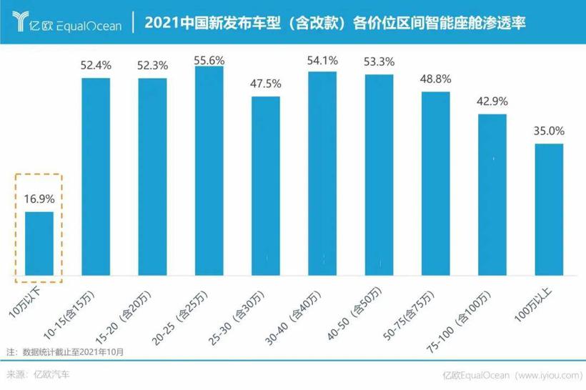 从市场渗透率来看,目前中国市场座舱智能配置水平的新车,2021中国新发布车型(含改款)10万以下价位座舱智能配置水平的新车明显断崖,渗透率约为16.9%。