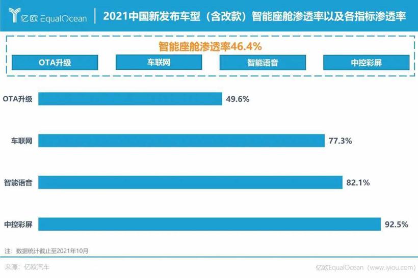 据亿欧智库即将发布的《2021中国汽车座舱智能化发展市场需求研究报告》,2021年中国新发布车型(含改款)智能座舱各指标渗透率表现中,车联网、智能语音、中控彩屏等功能的实现较为普遍,分别达到了77.3%、82.1%和92.5%,但OTA升级方面稍有不足,具体比例为49.6%。说明目前具有持续软件迭代能力的车企相对较少,仍有巨大的市场潜力未被开发。