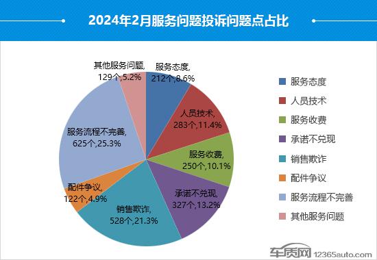 2月份的服务问题中,服务问题各投诉问题点的占比分布与1月份类似,服务流程不完善依旧是占比最高的服务问题,但投诉问题数和占比与1月份相比有所下降。销售欺诈本月投诉问题数降幅较小,占比较1月份提高了6.4个百分点,具体投诉问题点集中在“与宣传不符”,投诉增量来自部分自主和德系品牌车型。