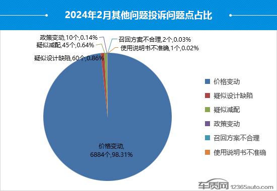 2月份的其他问题中,价格变动一家独大,几乎垄断了绝大部分的投诉故障数,占比较1月份提高21.1个百分点,投诉集中在部分自主品牌新能源车型。反观疑似设计缺陷和疑似减配,虽然投诉故障数较1月份略有增长,但占比却出现大幅下降。