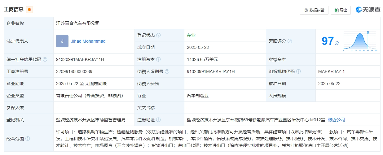 据天眼查信息显示,5月22日,江苏高合汽车有限公司正式成立,注册资本约1.43亿美元(约合人民币10.3亿元)。新公司位于江苏省盐城市,是一家以从事汽车制造业为主的企业。